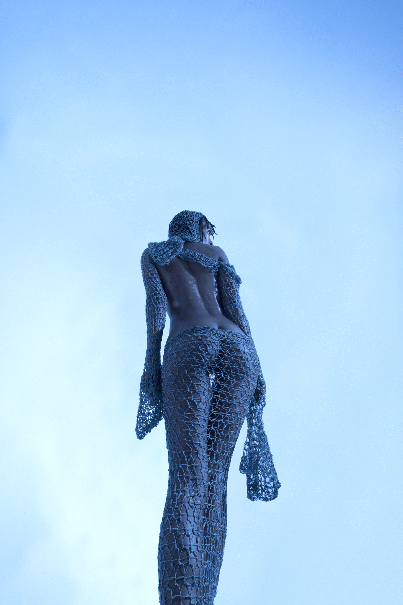 Featured in Hypebae Magazine, this editorial showcases muse Neema in a handmade crochet set in grey with gold accents. a maxi skirt and super-cropped top with a hood. Sensual, daring and unapologetically sexy.